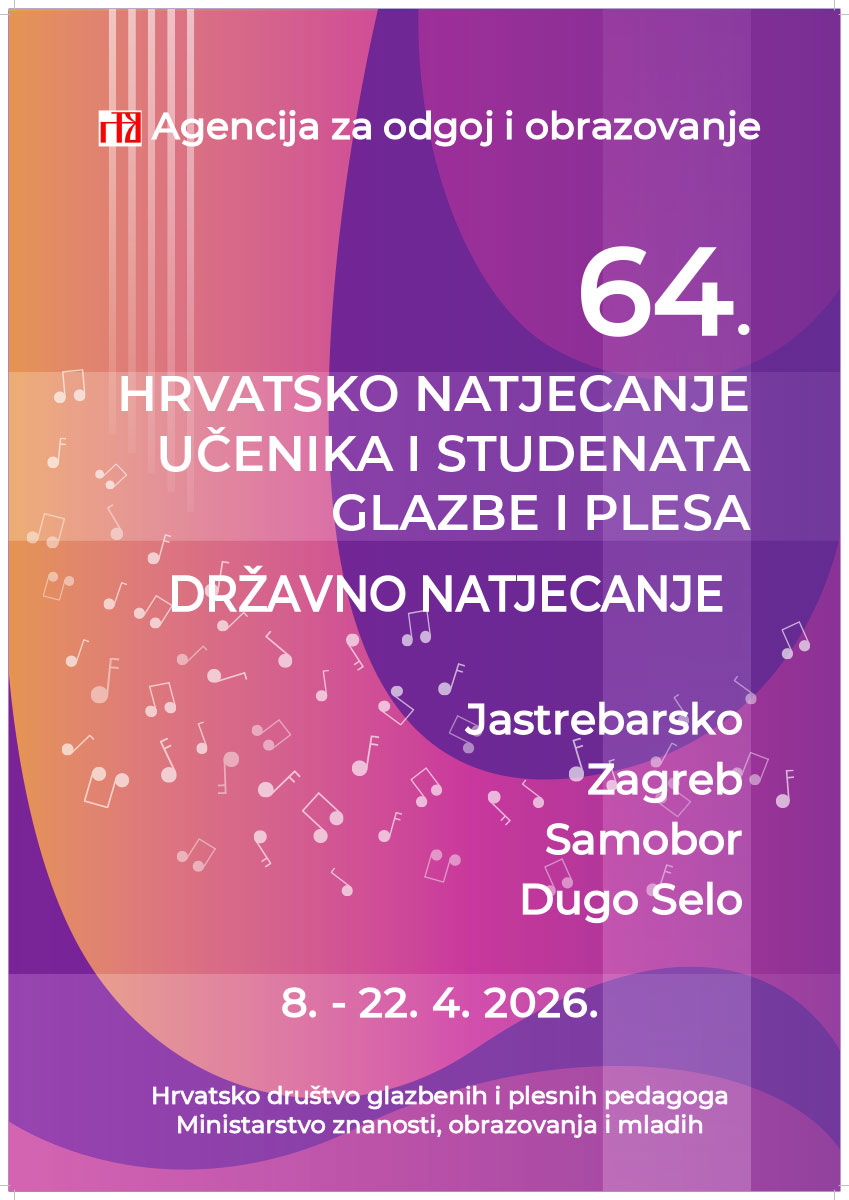 Od 8. do 22. travnja 2026. godine održat će se državna razina 64. hrvatskog natjecanja učenika i studenata glazbe i plesa u disciplinama: harmonika, harfa, udaraljke, zbor, klasični balet (solo), suvremeni ples (skupine), gudački i puhački instrumenti.
