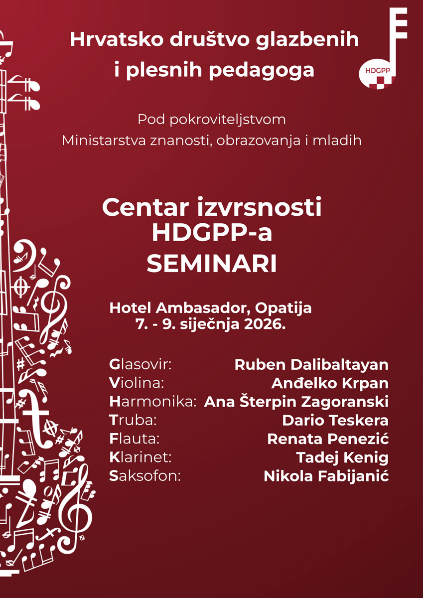 Pod pokroviteljstvom Ministarstva znanosti, obrazovanja i mladih od 7. do 9. siječnja 2026. godine u Hotelu Ambasador*****, Opatija bit će održan 24. po redu Centar izvrsnosti HDGPP-a za profesore i nadarene učenike s ciljem razmjene znanja, iskustava i inspiracije među kolegama te unapređenje rada u glazbenom obrazovanju. Predavači su istaknuti pedagozi i umjetnici s bogatim iskustvom, a njihova predavanja i radionice bit će prilika za osobni i profesionalni razvoj.